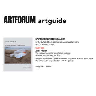 Jaime Pitarch's "The insistent persistence of failed horizons" reviewed by Jenny Wu on Artforum. "Peering into the courtyard through the glass door at the rear of Spencer Brownstone Gallery, visitors to “The insistent persistence of failed horizons,” Jaime Pitarch’s fourth solo exhibition here—saw a white ... Continue reading